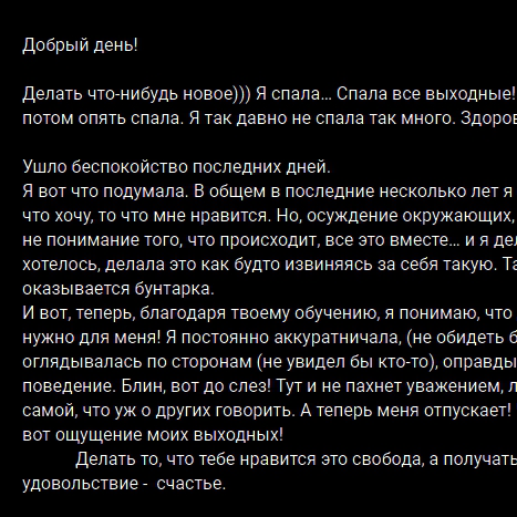 Ну и управляемые позоры - это тоже прекрасно. Мне кажется, что настолько свободно, как сейчас, я не чувствовала себя никогда. Просто потому, что я могу заявлять о своей позиции, я не боюсь, что я кого-то этим обижу, оскорблю или кто-то от меня отвернется. Например, мне 30 лет, я не хочу детей, и это первый год, когда я могу сказать: «Я не хочу детей», и не чувствовать за это стыд и вину. Еще важный момент, что после работы с Полиной, я закрыла свою психотерапию, которая длилась 4 года. Я поняла, что я достаточно здорова, все достаточно хорошо для того, чтобы просто жить и заниматься своей жизнью, а не бесконечной проработкой себя.