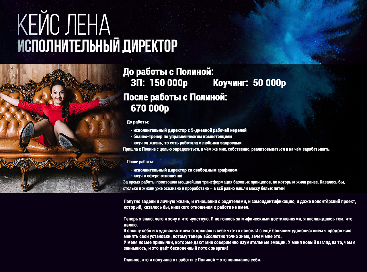 Я хотела расти быстрее, и искала коуча, с кем возможно это сделать. Один из моих жизненных принципов: если я чего-то не знаю/не умею – лучше взять наставника, который этот путь прошёл. Зачем тратить 5-10 лет самостоятельно изобретая "велосипед", когда можно заплатить и сэкономить несколько лет, не расшибая лба. ВРЕМЯ ДОРОЖЕЭто ещё один принцип, которым я руководствуюсь в принятии решений. Кстати, в коучинге у Полины я оформила для себя и другие принципы, добавляла что срабатывало в процессе получения моих успешных опытов. Это сильно облегчает жизнь, когда есть на что опереться, так как на принятие решений требуется энергия.