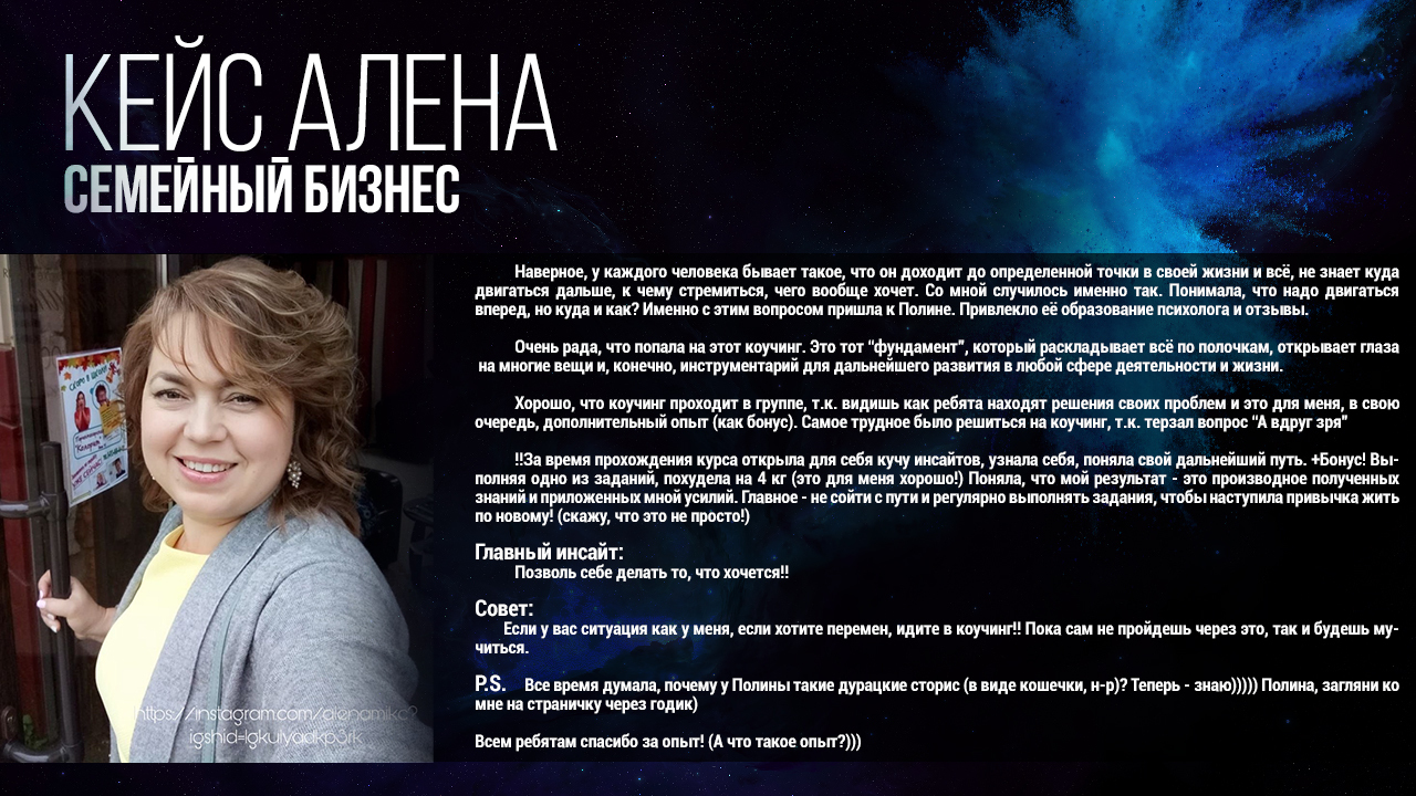 Главный инсайт: Когда занимаешься тем, что любишь – ничто не может остановить. И тогда делаешь не из «надо», а просто делаешь, и это интересно. И тогда рост происходит ествественно. А когда что-то тормозит – разбираться сразу (чего я здесь боюсь? какие последствия у этой остановки, и согласна я на них или нет?), анализировать и принимать решение.
