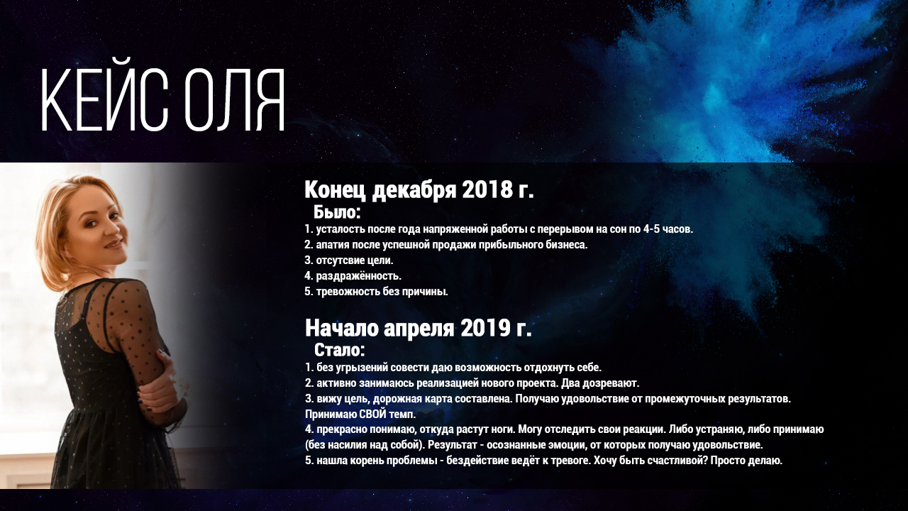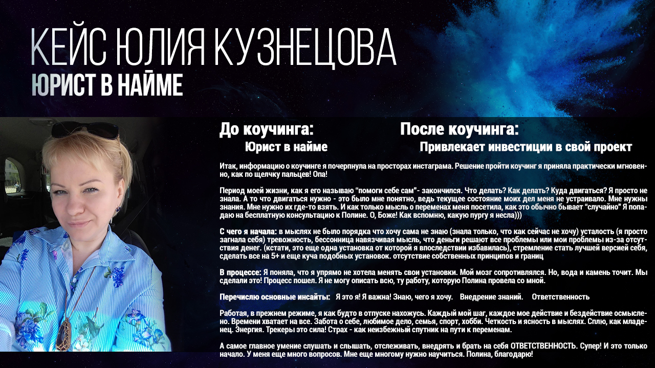 Я была на самом старте новой деятельности (тоже коучинга), но ещё никак её не монетизировала. Тренировалась на знакомых – они получали крутые результаты (увеличение дохода почти в 10 раз за 2 месяца), но я не могла брать деньги за свою работу. Вот такой вот диссонанс. Поняла, что у меня психологические проблемы с обесцениванием себя, также с детства «синдром отличницы» - из-за чего боялась ошибиться и, соответственно, не делала новых целевых действий. Ещё было отношение к ответственности как к чему-то тяжёлому, и это, конечно, сильно мешало.